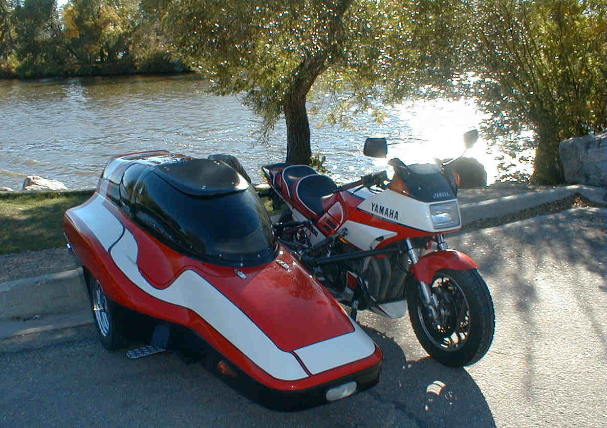 The second pic is his other joy, his FJ1200 Yamaha/Hannigan. He raked the lower triple clamp and built a mounting system and subframe for this rig. It runs 125/85 X 16 radial car tires on the bike as well as a radial 145 X 12 on the car. Unlike the BMW rig, the Yamaha is built close to the ground for spirited pavement running only and He's really happy with how it gets the job done. The FJ1200 engine is powerful and torquey and with the aftermarket fork springs and rear shock as well as his own suspension creation on the sidecar wheel it handles quick and steady.
